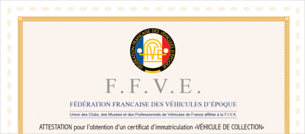 La FFVE est habilitée à vous délivrer une attestation de datation et de caractéristiques appelée aussi « attestation FFVE » (pas un certificat d’immatriculation/ carte de grise de collection), avec un dossier réglementaire vérifié par nos soins.